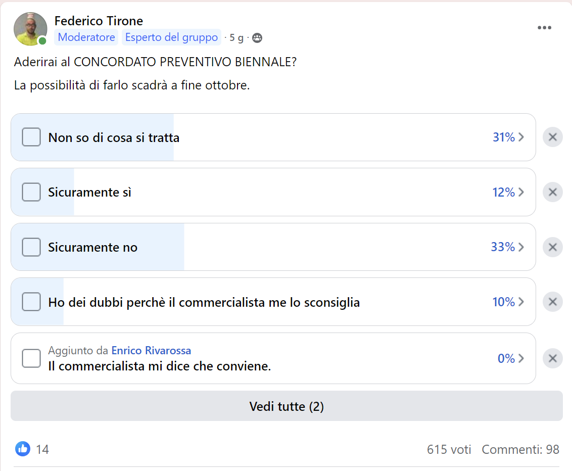 Un recente sondaggio che ho pubblicato sul gruppo Facebook Odontoiatria Italia ha dimostrato che molti dei colleghi dentisti non sanno nulla del concordato preventivo biennale mentre molti altri sono fermamente intenzionati a non aderire.