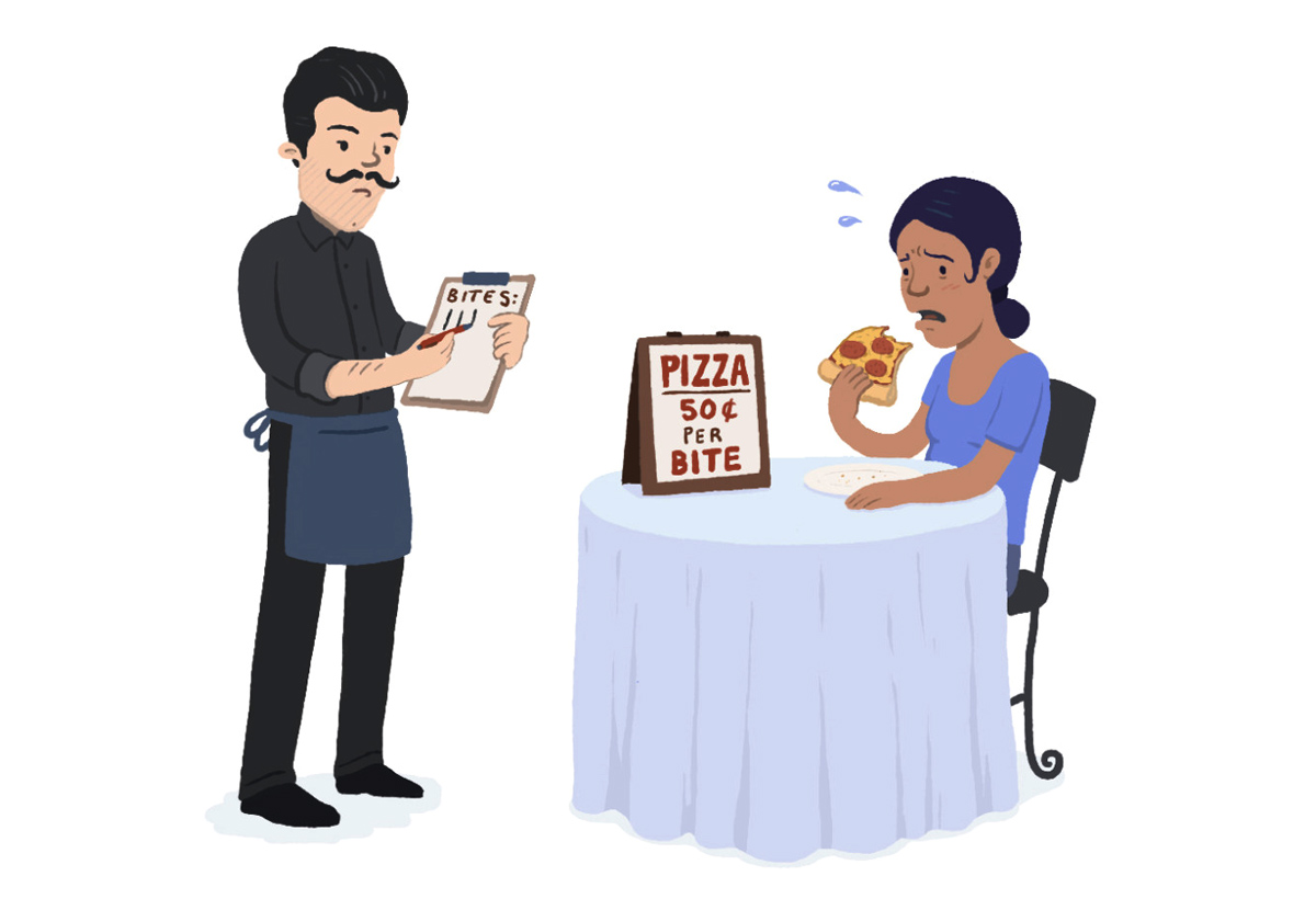 Se sei onesto con te stesso sono certo che lo scenario 3 ti farebbe provare l’esperienza gastronomica peggiore. Ti ritroveresti con l’ansia del contare i bocconi sapendo che ogni boccone aumenta la somma da pagare, cercheresti di forzare la dimensione dei bocconi risultando inelegante e perdendo il gusto del mangiare e ti troveresti magari a dover decidere se valga la pena o no finire quell’ultimo pezzettino di carne nel piatto o quell’ultimo bocconcino di pane caldo appena sfornato dallo chef stellato. Se vogliamo rendere ancora più negativa l’esperienza, possiamo pensare ad uno scenario 3 estremizzato, nel quale dopo ogni boccone il cameriere passa a riscuotere i cinque euro dovuti. “Not a big deal” direbbero gli anglosassoni. Di certo un’esperienza di merda direi io.