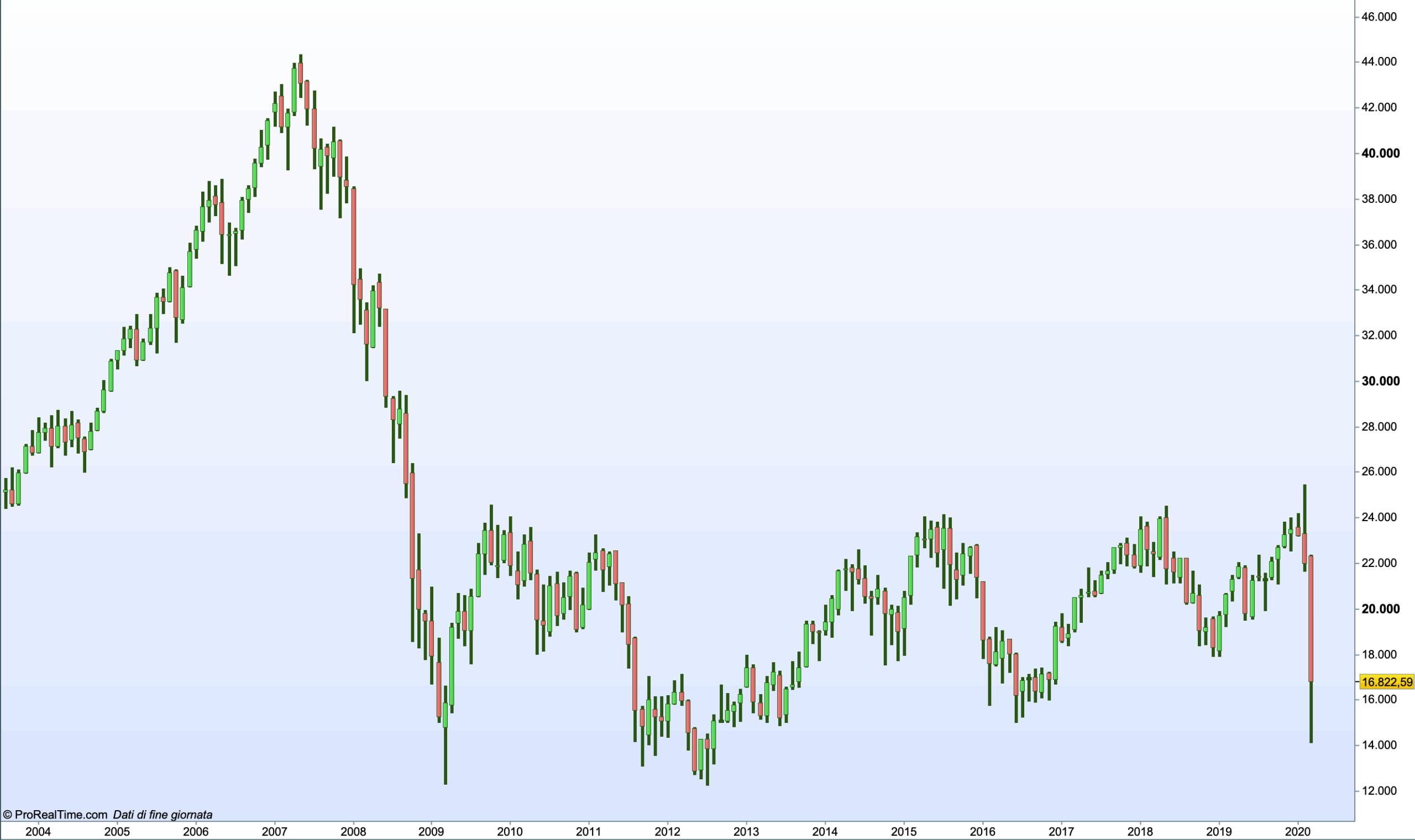 Ergo, con questa nuova crisi, che colpirà numericamente molto più gli Stati Uniti che noi, come mostra il loro passaggio in prima posizione come numero di contagiati (e non di morti e c’è da farsi qualche domanda qui…?) i loro indici hanno ritracciato un po’, mentre noi flirtiamo di nuovo con i nostri minimi, cosa che però, negli ultimi 12 anni, abbiamo fatto già altre tre volte senza il COVID…??♂️
