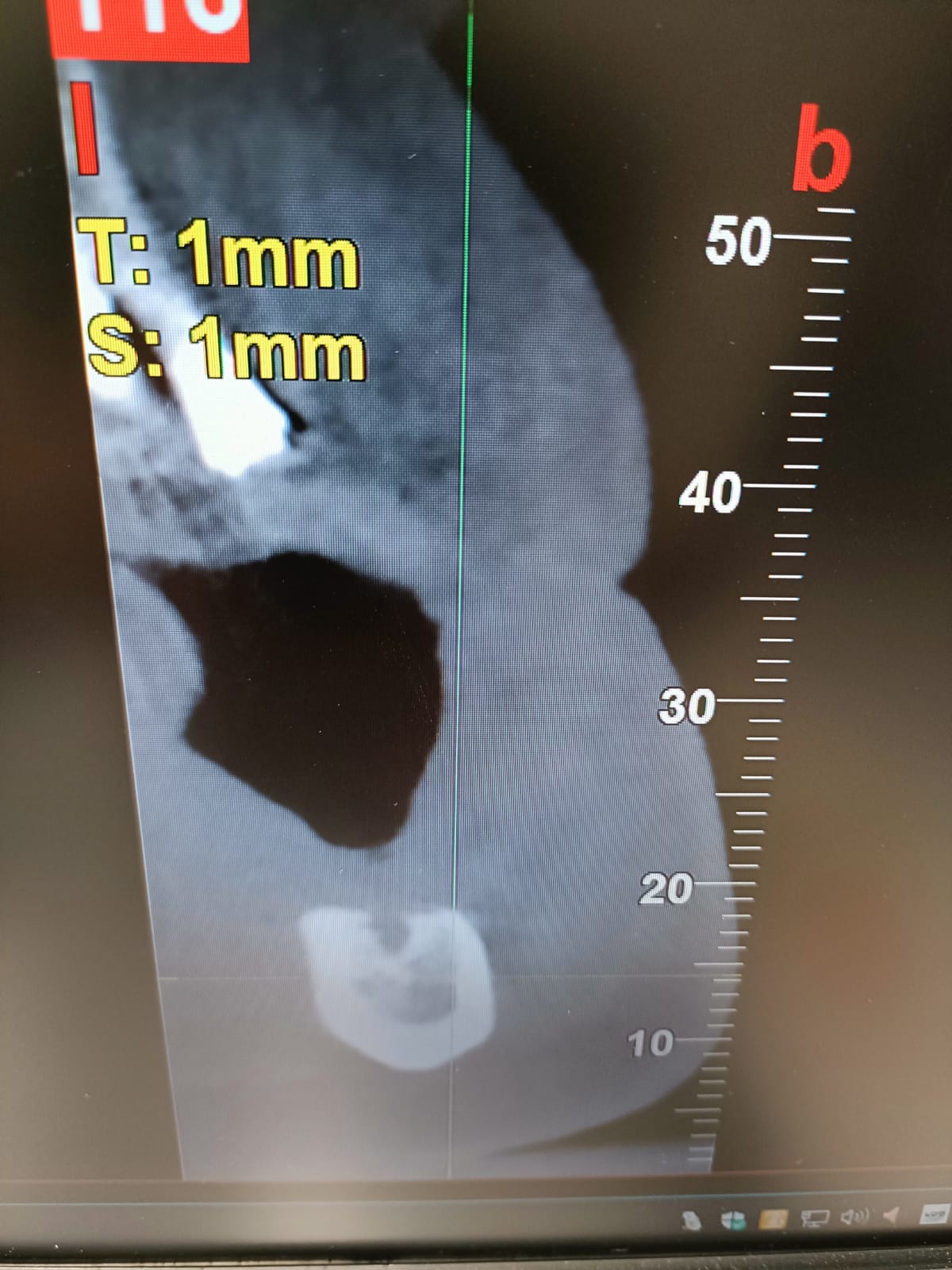 Le caratteristiche principali del caso erano il fatto che la paziente avesse 34 anni, pur con la mandibola tipica di un’ottantenne edentula da decenni e che il mentoniero, di sinistra fosse marcatamente in cresta e ricompreso all’interno di una zona di cicatrizzazione ossea dovuta a precedenti fallimenti chirurgici.