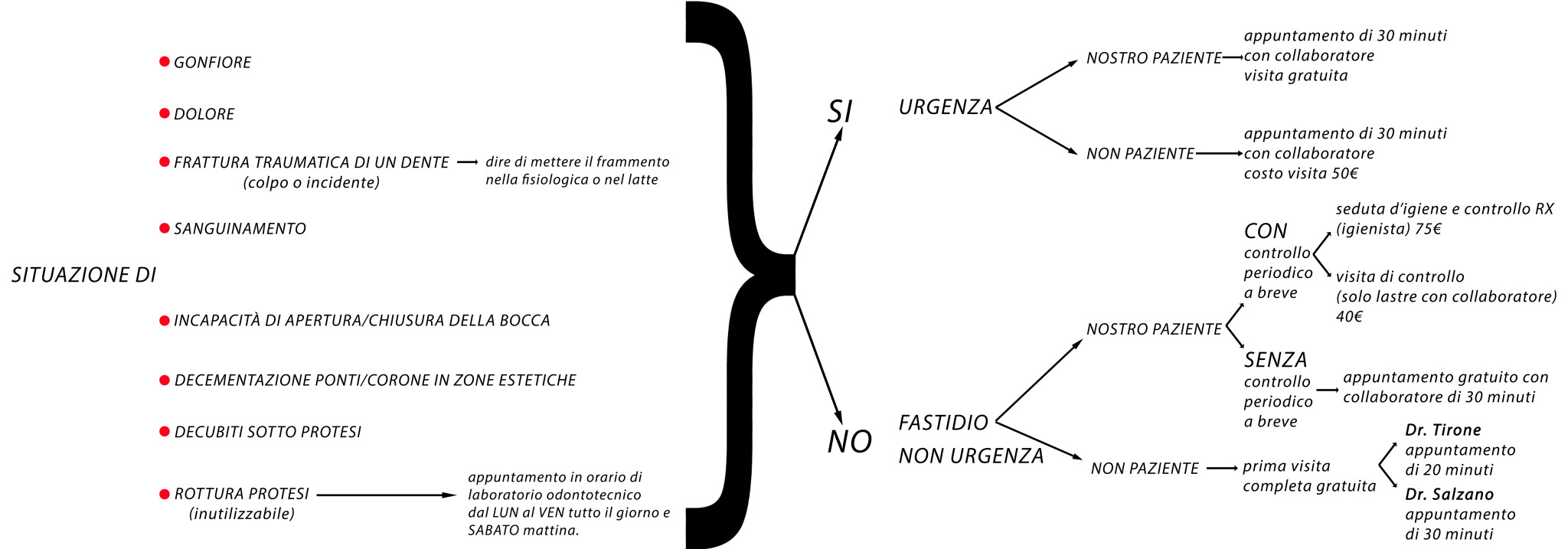 Se infine il paziente, privo di reale urgenza, non è un nostro paziente verrà programmato per una prima visita (che da noi come sai è gratuita) in uno spazio a questo dedicato. Di nuovo la flow-chart è a prova di scimmia, se con me 20 minuti se con Salzano 30 minuti… lui crede ancora che “più tempo in visita più accettazione”…