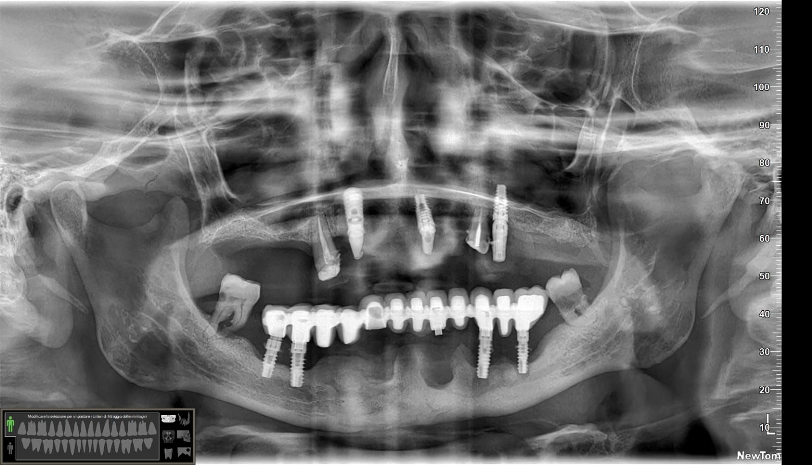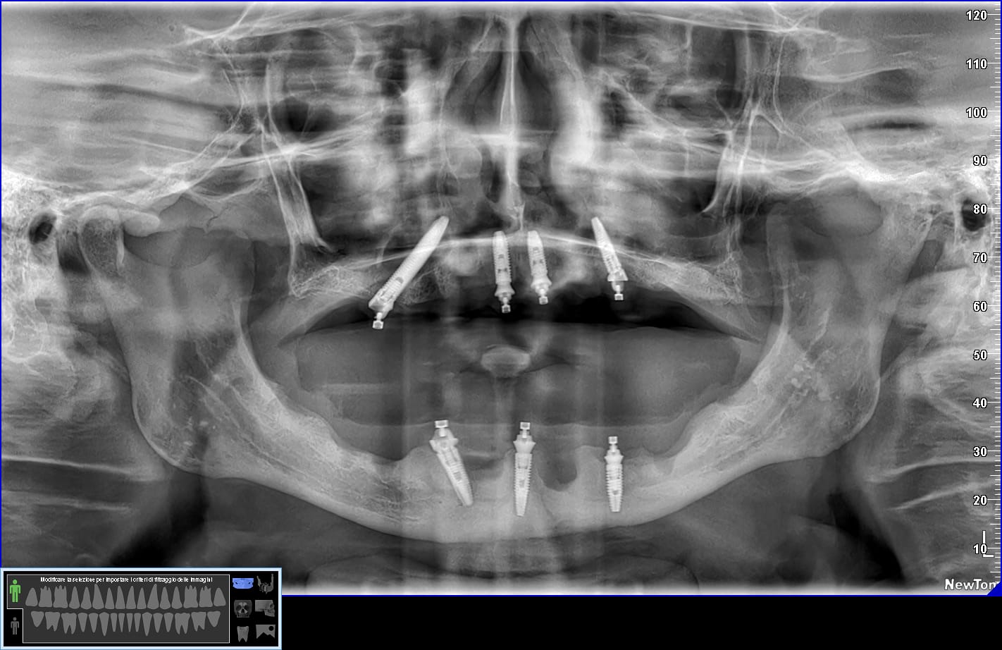 Ah… questa è la panoramica finale, inferiormente non ho trovato il modo per mettere 4 impianti ma solo tre… vedremo se aggiungerne uno. E non farti ingannare dall’immagine: il mentoniero di destra non è quello che sembra più distale ma quello meno visibile più mesiale.